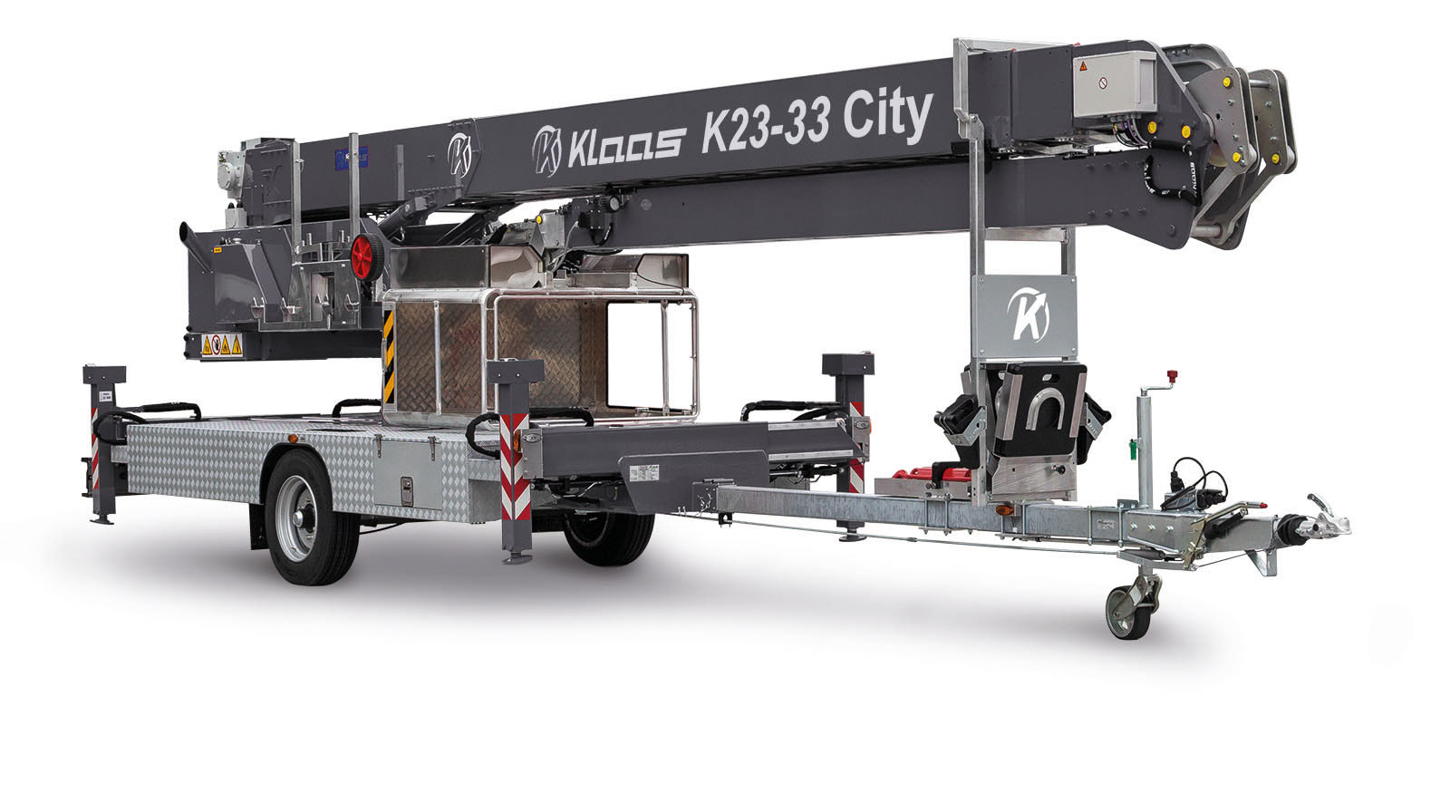 Der K23-33 City mit einer Hakenhöhe von fast 33 m ist seit vielen Jahren einer der beliebtesten Anhängerkrane aus dem Hause Klaas. Mit seiner seitlichen Reichweite von 23 m bei einer 250 kg-Last verfügt er über einen enormen Aktionsradius. In wenigen Minuten ist der Alu-Kran werkzeugfrei in eine Arbeitsbühne umgebaut und ermöglicht so vielseitiges, sicheres Arbeiten an der Baustelle. Dank seines Selbstfahrantriebs kann er in jede passende Lücke punktgenau rangiert werden, durch seine einschiebbare Deichsel auf 7 m verkürzt werden. Als Einachser und mit einem geringen Eigengewicht von 3,5 t ist er auch auf engem Raum gut zu händeln.