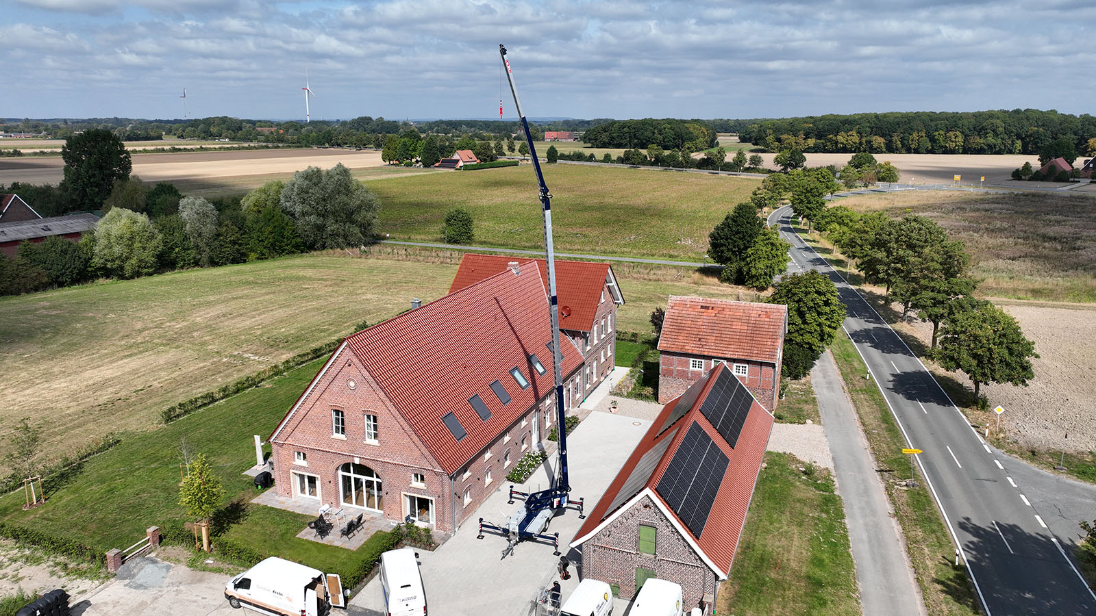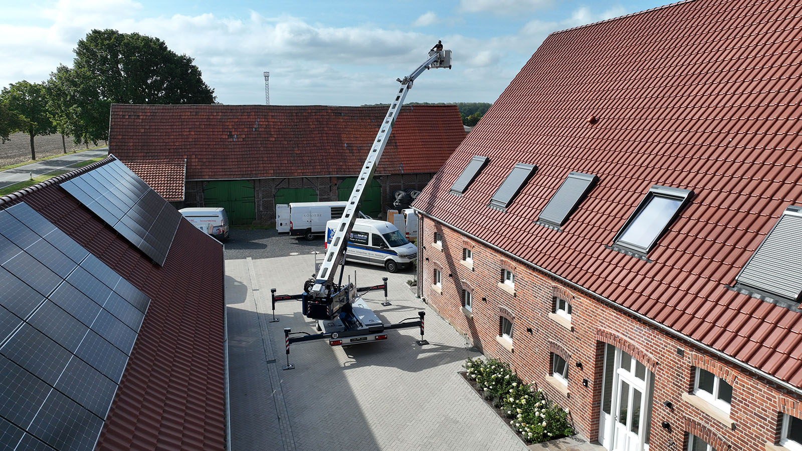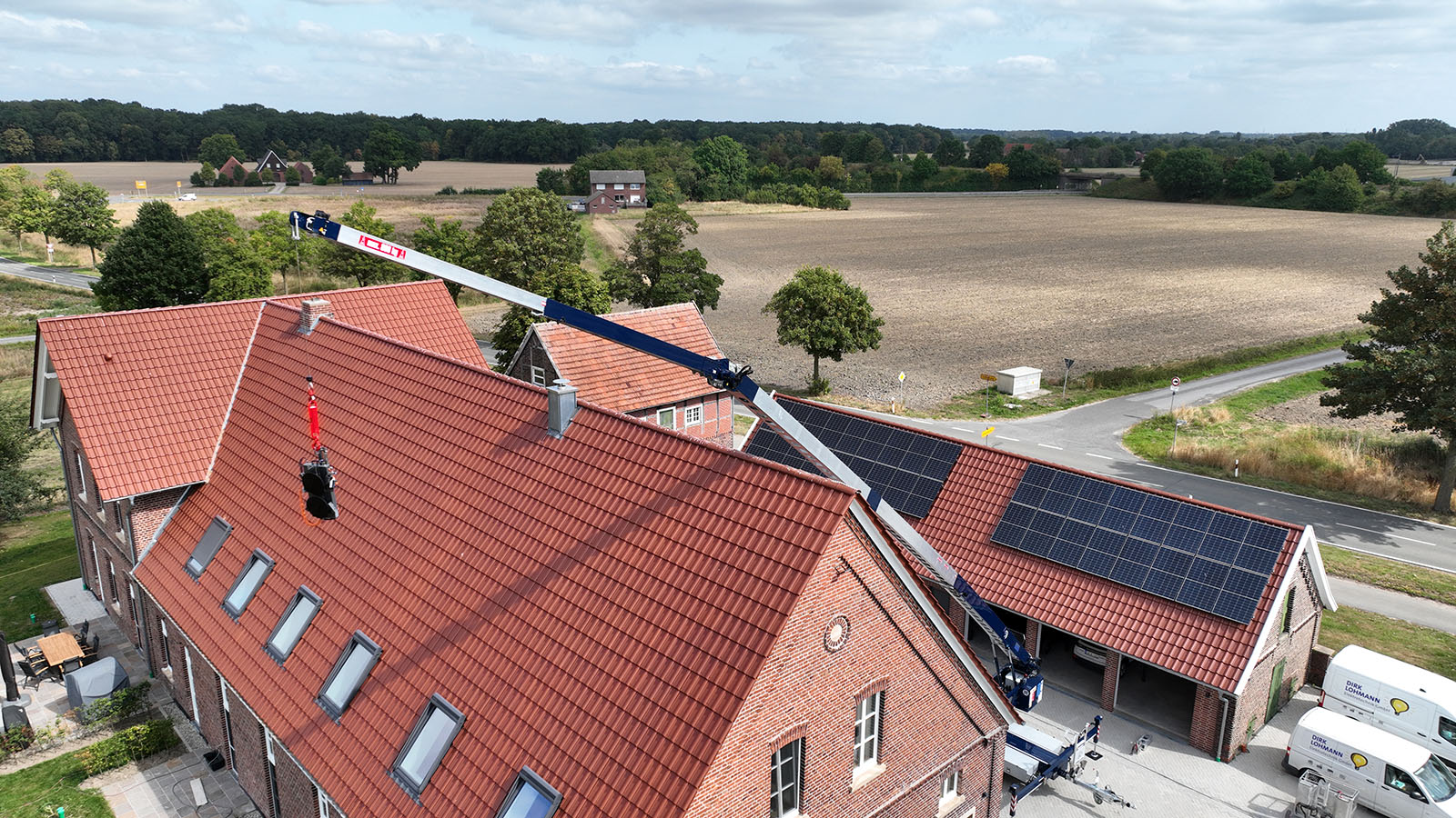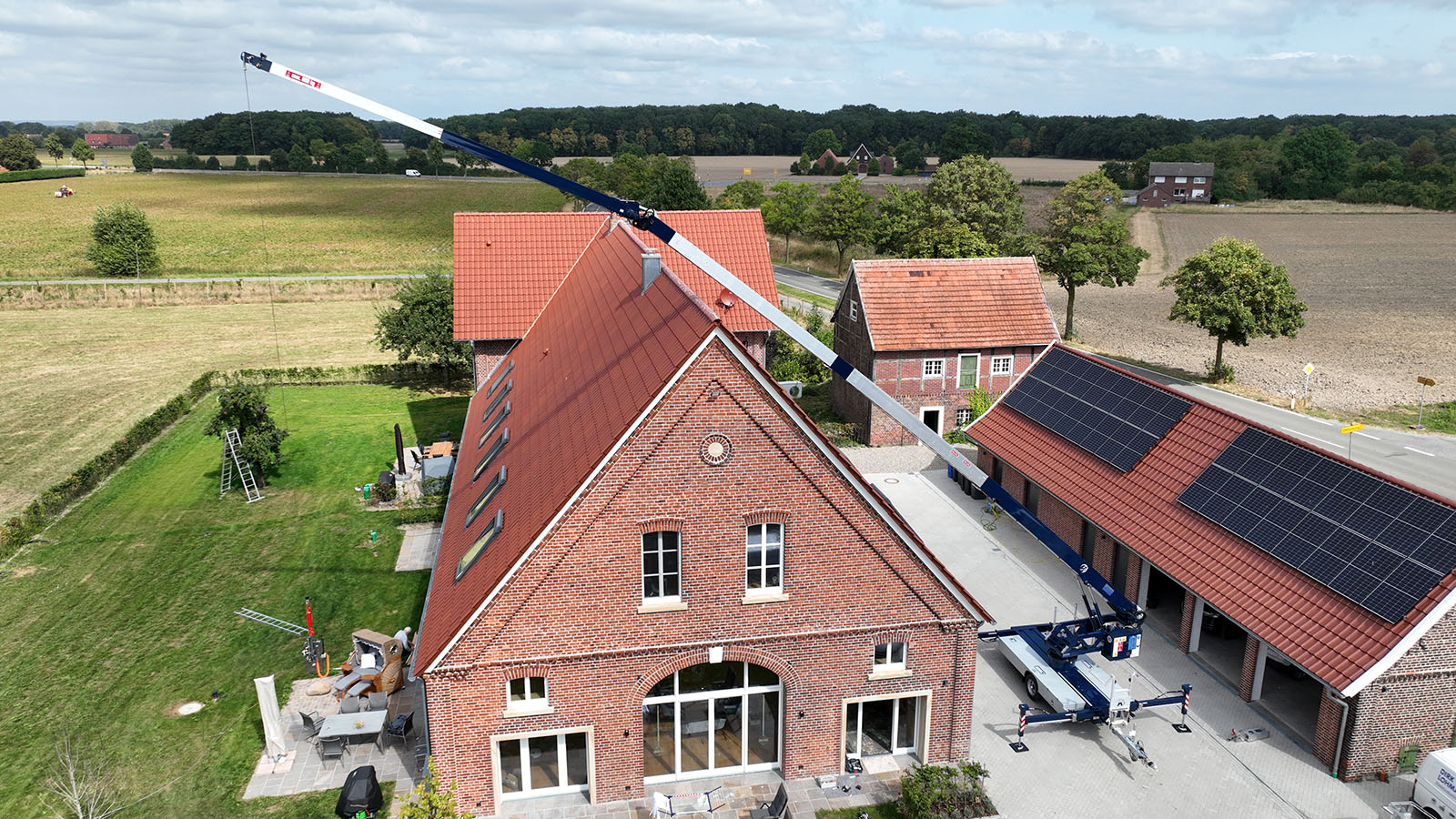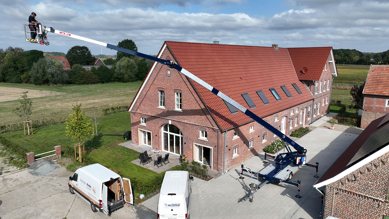 Der K350 E ist ein Anhängerkran der 3,5-Tonnen-Klasse mit modernster Ausstattung, hohem Fahrkomfort und hervorragenden Leistungswerten. Seine maximale Traglast liegt bei 1.500 kg, die seitliche Reichweite mit einer Last von 250 kg bei stolzen 22 m. Ein absolutes Klaas Highlight ist die hydraulisch teleskopierbare Klappspitze. Im Bühnenbetrieb oder auch bei komplexen Montagearbeiten kann die Klappspitze auch unter Last bequem per Fernsteuerung ein- und austeleskopiert werden. Der komplette Kranaufbau wird damit auch in beengten Verhältnissen zum Kinderspiel. Zukunftsweisend ist der akkubetriebene Elektromotor, der den Kran fast geräuschlos antreibt. Der große Lithium-Akku kann an jeder herkömmlichen 230-Volt-Steckdose auch während des Kranbetriebes aufgeladen werden, was allerdings selten notwendig ist, da der K350 E problemlos einen ganzen Arbeitstag lang ohne Nachladen eingesetzt werden kann. Der hochwertige Lithium-Akku benötigt aufgrund seiner Leistungsstärke nur wenige Ladezyklen und ist daher besonders anwenderfreundlich und wertstabil.