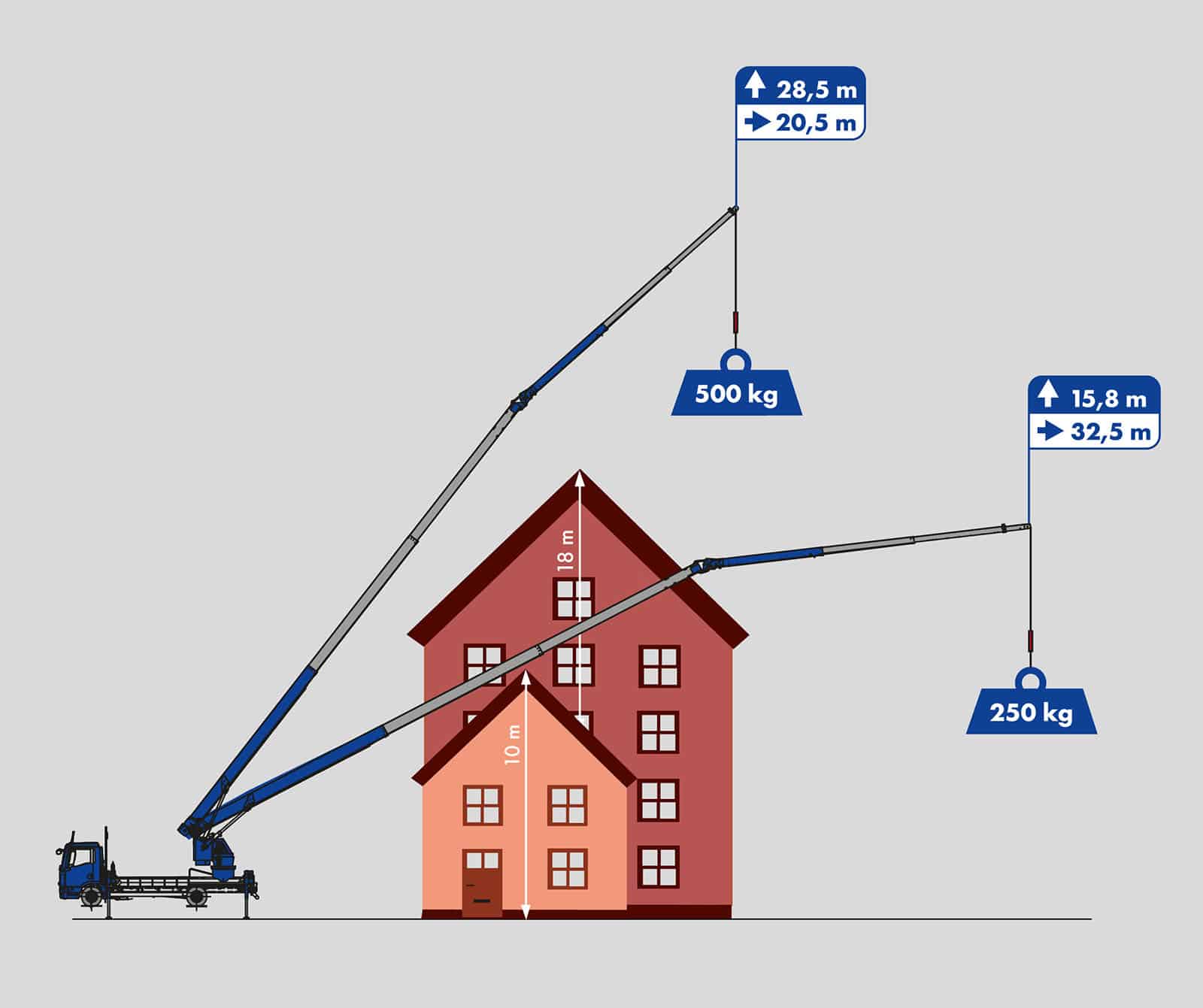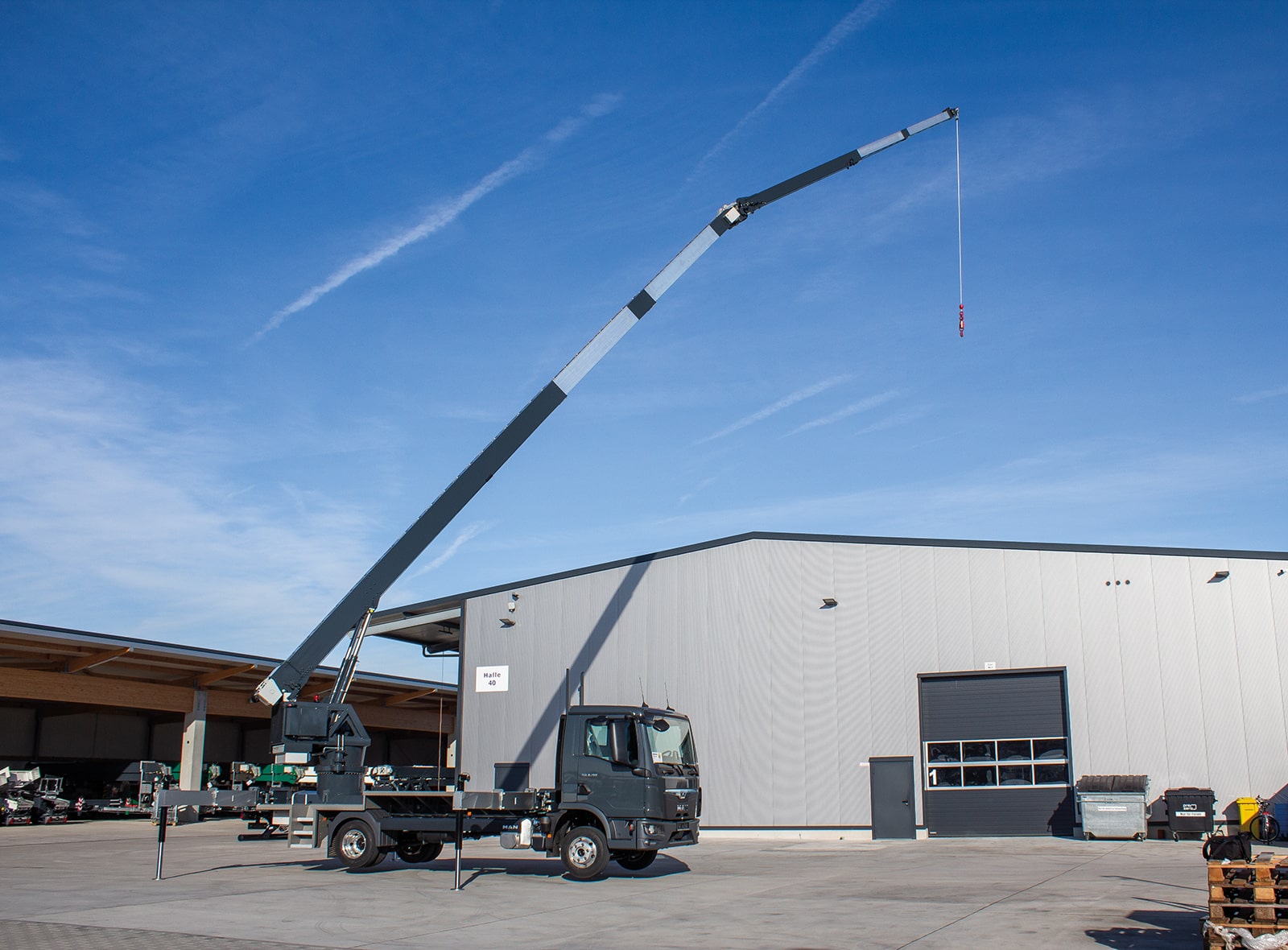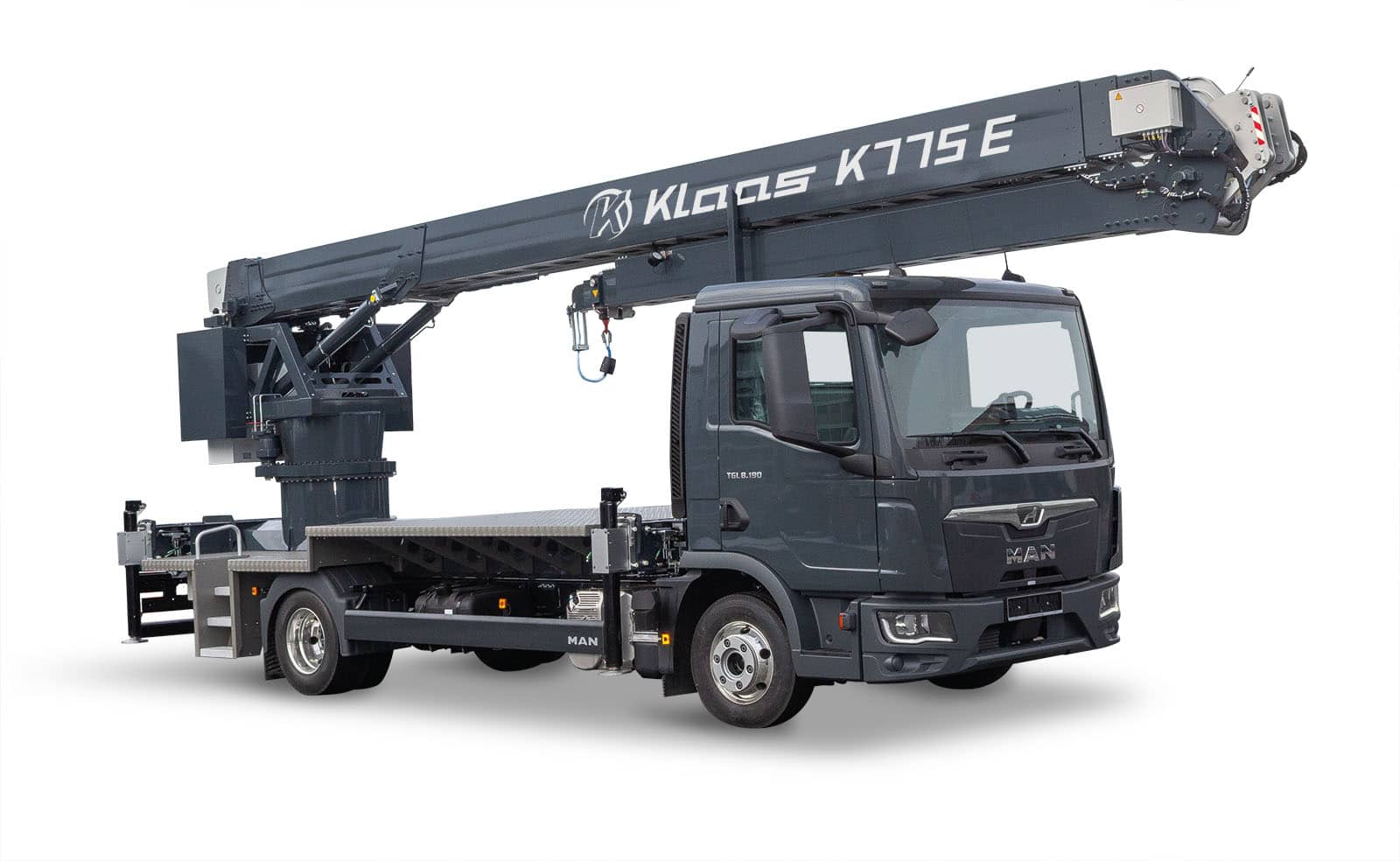 Dank eines kurzen Oberwagens dreht der K775 E vollständig innerhalb der Spiegelkontur des LKW. Das macht ihn besonders prädestiniert für Arbeiten in innerstädtischen und beengten Baustellensituationen. Die zweifach hydraulisch teleskopierbare Klappspitze ermöglicht präzises Arbeiten auch dort, wo Platz Mangelware ist.
