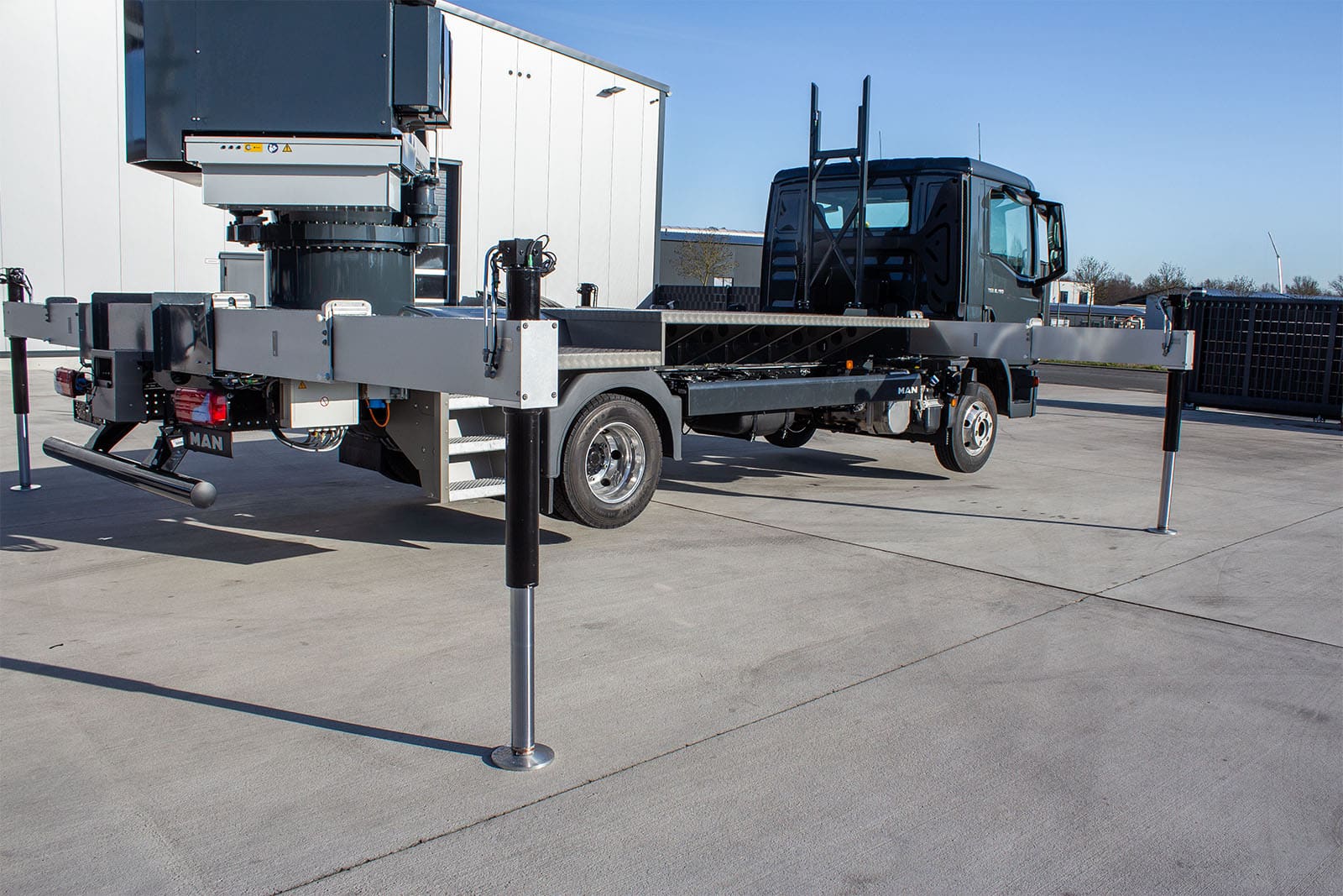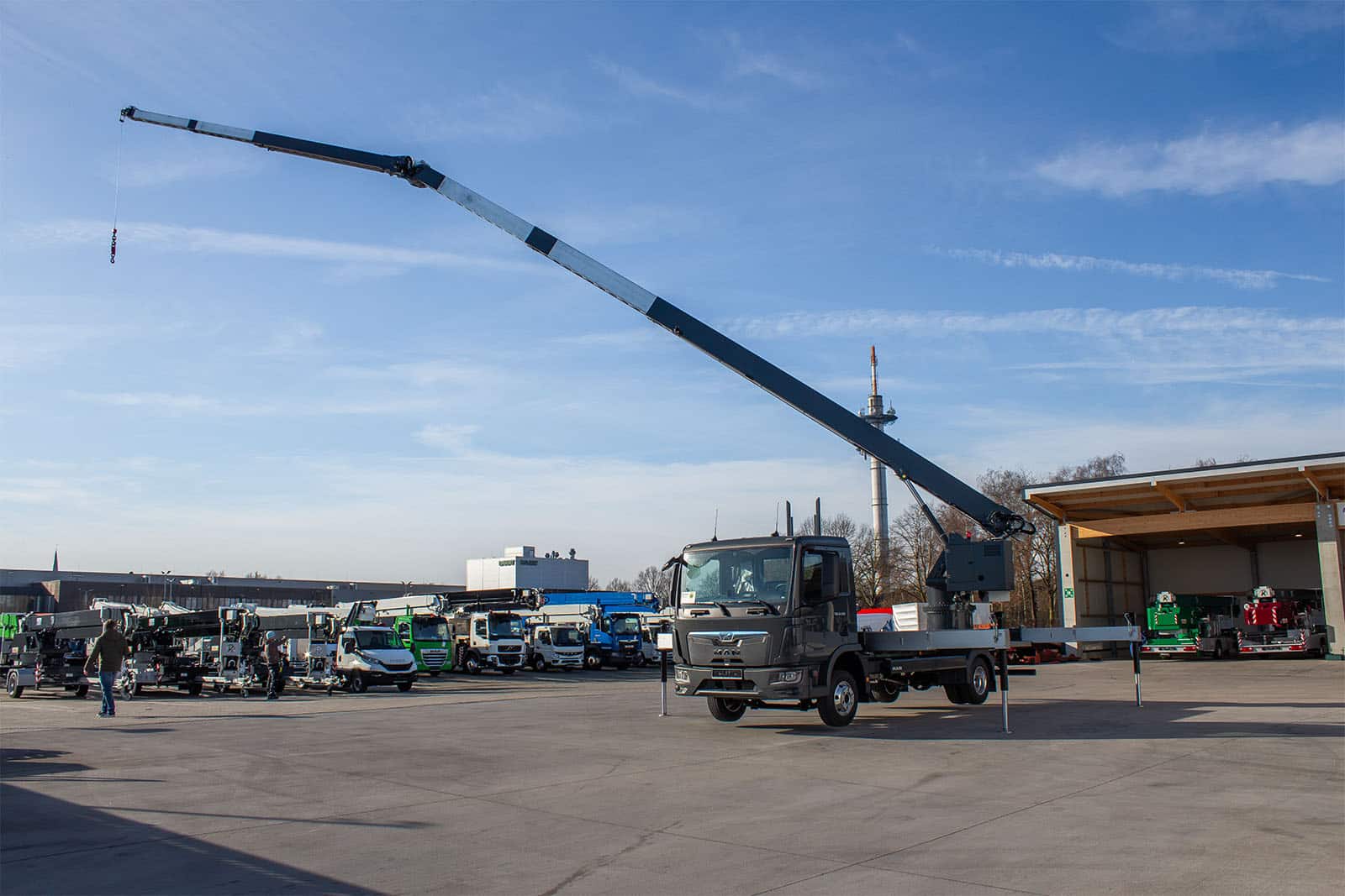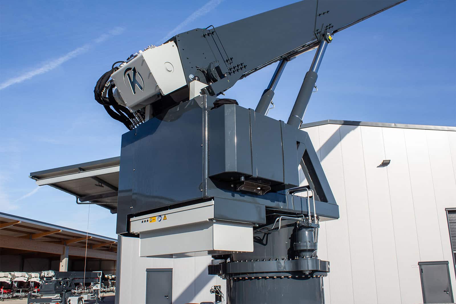 Dank eines kurzen Oberwagens dreht der K775 E vollständig innerhalb der Spiegelkontur des LKW. Das macht ihn besonders prädestiniert für Arbeiten in innerstädtischen und beengten Baustellensituationen. Die zweifach hydraulisch teleskopierbare Klappspitze ermöglicht präzises Arbeiten auch dort, wo Platz Mangelware ist.