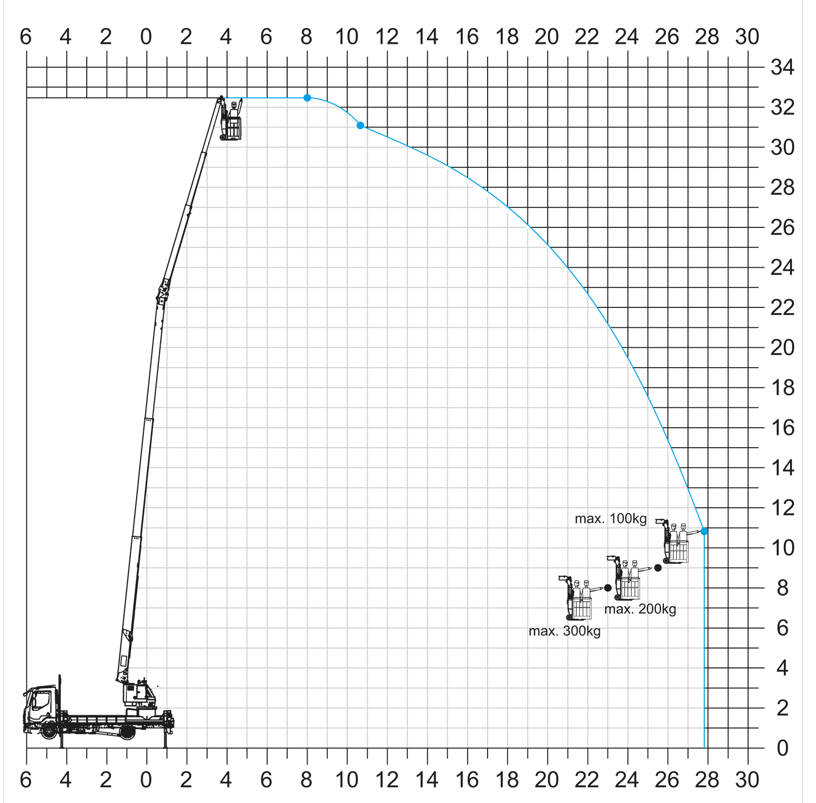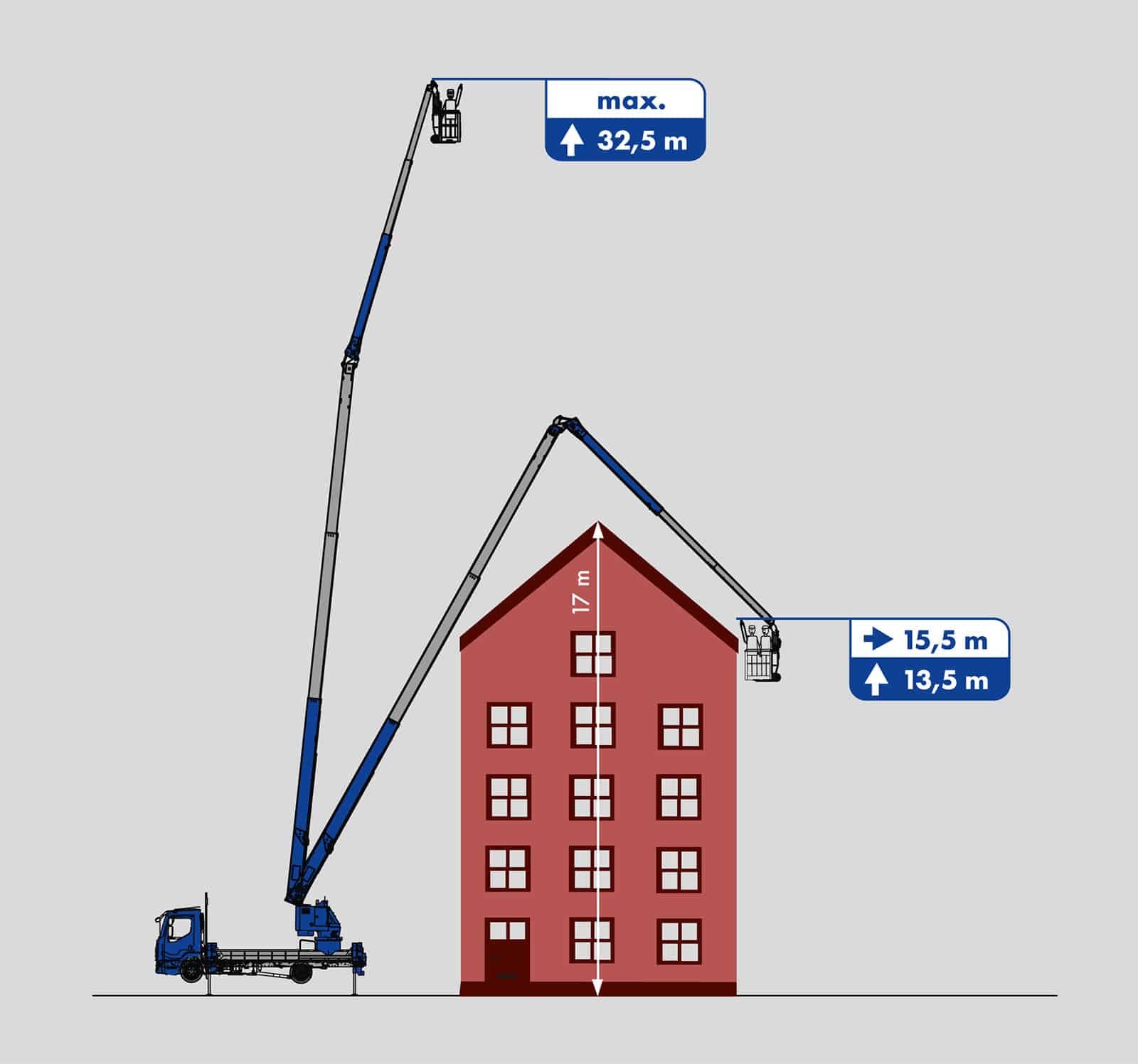 Der Lutz ist eine leistungsstarke 7,5-Tonnen-Arbeitsbühne mit einer maximalen Arbeitshöhe von 32,5 m und einer außergewöhnlichen seitlichen Reichweite von 22 m bei einer Korblast von 300 kg. Damit setzt er neue Maßstäbe in seiner Klasse.