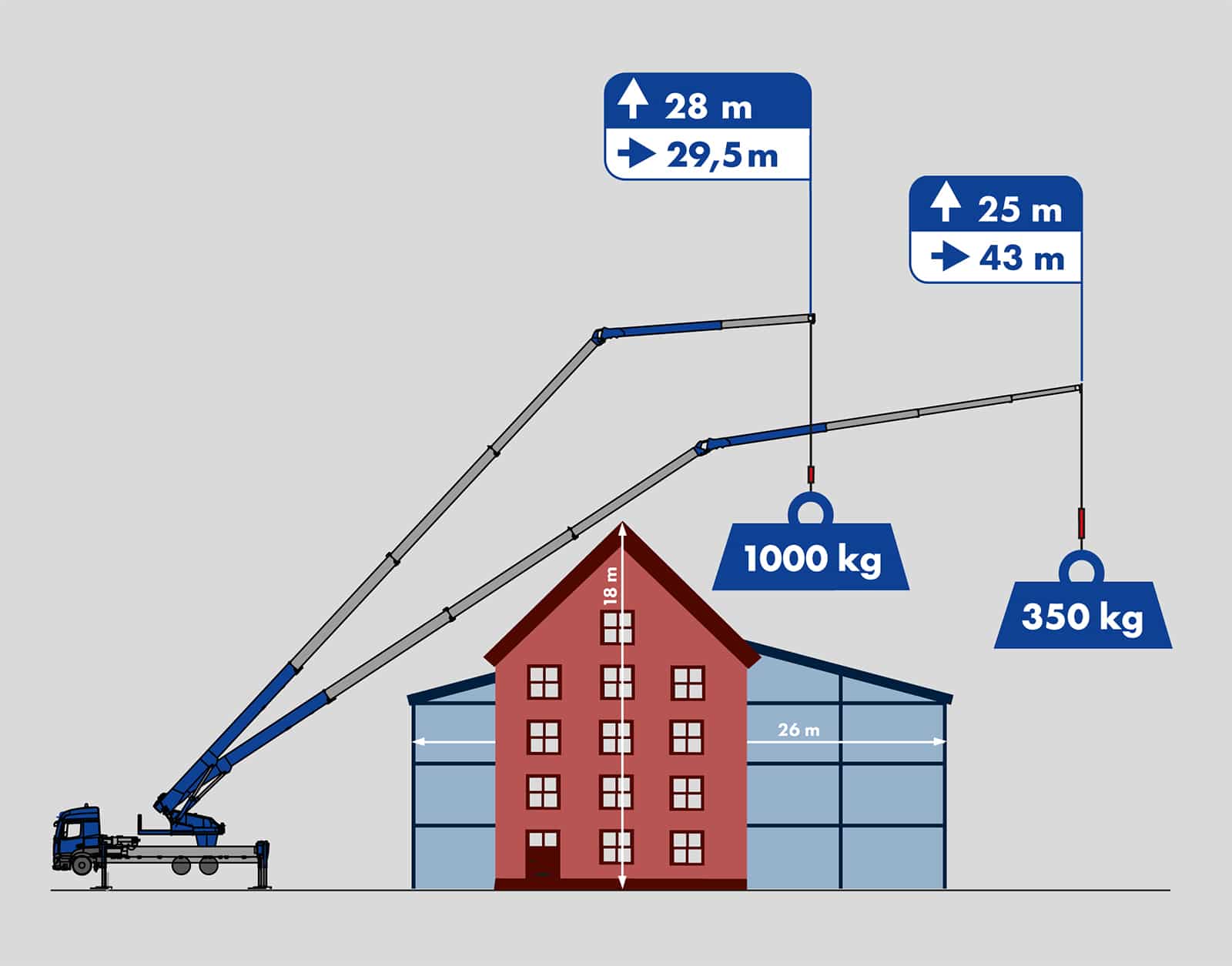 The K1003, with its hook height of almost 53 meters and a maximum lifting capacity of 6 tonnes, is one of the large Klaas truck cranes. It is mounted on a three-axle truck with a rear steerable axle. Thus manoeuvrability and comfortable handling are ideally combined with the enormous reach of the aluminium boom. The K1003 works with a dual telescopic fly jib, on which both extensions can be extended simultaneously and to the same extent. This means that the weight being carried is optimally distributed and the fly jib can be used extensively even in tight construction situations.