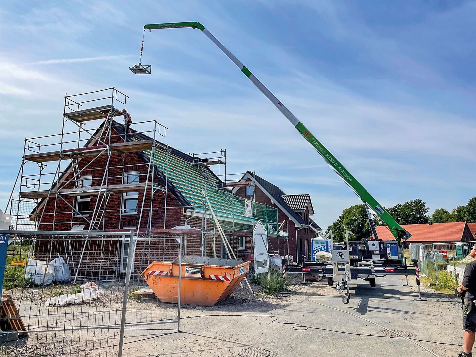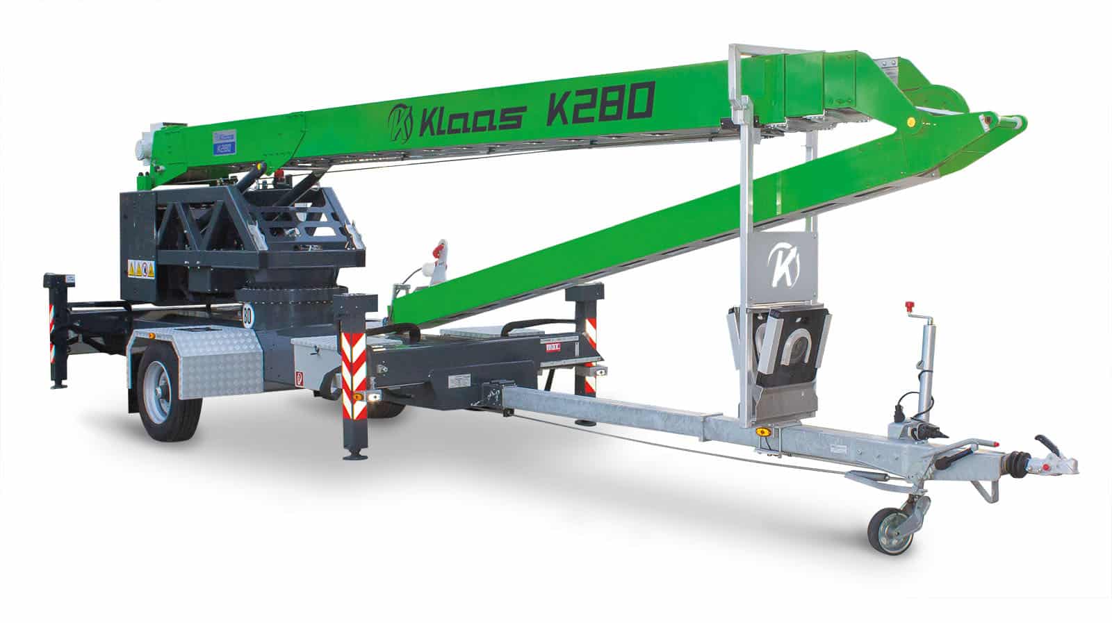The K280 is a reliable all-rounder for roofers and carpenters, most of whom work in the private construction sector. Its hook height is 25.5 m, the reach with a load of 250 kg is a proud 18.50 m. Since its buckling edge height is around 22 m, the K280 can also reach the rear sides of multi-storey residential buildings without having to move the crane. A hydraulic folding joint, which is operated by remote control, ensures comfortable and quick erection. Thanks to its self-propelled drive and a small footprint, the Klaas lightweight is the ideal crane for narrow construction sites.